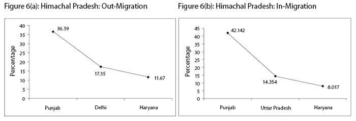 In Himachal, in-migration from other states and out-migration to other states is far below than Uttarakhand. A total of 3.44 lakhs or 5.70 percent of the total population enumerated as in-migrants and 4.51 lakhs persons or 7.41 percent out-migrated, implying net-migration (in-out) of 1.7 percent of the total population, Himachal was losing more population. Figures 5(a), 5(b), 6(a) and 6 (b) shows the major states of ‘out’ and ‘in’ migration, from and into these states.