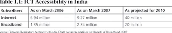 Education is one of the most potential weapons to fight against socio-economic maladies like poverty and inequality. Education is equally key to enhance India’s competitiveness in the global economy especially in view of interdependence and integration of Indian economy with world economy posing many challenges like maintaining international quality in higher education and acceptability and sustainability of skilled manpower. This seems to be more important for a country like India which is the second largest system of higher education, next only to USA, Therefore, ensuring access to quality education for all, in particular for the poor and rural population, is key to the economic and social development of India. Looking at the ground reality, it gives a dismal picture of the state of higher education in India. The Gross Enrolment Ratio (GER) in India is 12 percent while that of some developed countries is around 70 percent , Ballal (2009). One of the reasons of such a poor state of affairs may be attributed to concentration of educational institutes in the urban areas while majority of population live in rural areas. This is evident from the fact that in India only as negligible as 20 percent of Higher Education Institutes are located in the rural areas with more than 65 percent of its population while the remaining 80 percent of Institutions are located in urban or Semi-urban areas which constitute only 30 to 35 percent of population. This invariably reflects gross disparities in access to higher education in India. Moreover, over the years Information and Communication Technology (ICT) has been emerging as a potential alternative to ensure greater accessibility to higher education beyond geographical and political boundaries with all its advanced tools like teleconferencing, email, audio conferencing, television lessons, radio broadcasts, interactive radio counseling, interactive voice response system, and CD ROMs and it can also facilitate many such academic and administrative activities with e-orientation (Sharma, 2003; Sanyal, 2001; Bhattacharya and Sharma, 2007). Through broadening the international dimension of educational services to greater and expanding meaningful collaborations with internationally acclaimed global players in higher education, e-learning vis-à-vis ICT can really make higher education easily accessible, affordable and qualitative leading to the upliftment of the socio-economic status of the people. But in India ICT aided e-learning is in an embryonic state due to immature growth of ICT sector as evident from the Table 1.1. Although the growth of e-learning is gradually growing, much remains to do to ensure its visibility particularly in view of its projected global market size of exceeding $52.6 billion by 2010. Moreover, the apprehension of ineffectiveness and dilution in quality of education owing to a shift from conventional mode of imparting higher education to online modules seems to be a major obstacle on the way of accommodating required changes in the system.