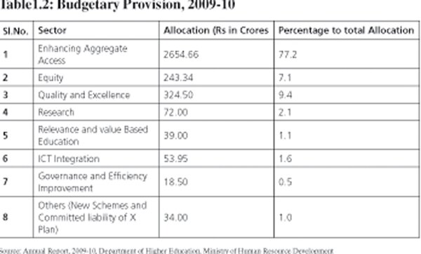 In order that the trickle down effects of higher education benefit the economy at large it is essential that inequalities of access to higher education are reduced substantially. The inequalities are diverse and multidimensional. It may vary from quality to gender, from technology to region. Despite its large size, the higher education system in India is far away from the reach of the bulk of the socially economically and culturally underprivileged section of the population and cannot meet the growing demand for higher education, especially from weaker sections of the society including culturally, economically, and educationally backward people. It caters to the requirement of only about 10 percent of youth in the relevant age group (18–24 years), while corresponding figures are more than 50 percent for most developed countries and 20 to 30 percent for developing countries, Chauhan (2008). Further, the absence of equity and inclusiveness in the system is clearly discernible from the fact that the intensity of enrolment in rural areas is low compared to that of urban and too low especially among SC, ST and OBC. On gender front, the access to higher education is also low for female as compared with male, the GER being 15.25% for the former and 11% for the later, Thorat (2006). Many factors can be attributed towards such disparity like financial constraints and lower status of women, lack of proper implementation of ongoing programmes and absence of political will most importantly contribute to inequity and non-inclusiveness in the system. Looking at the ground reality financial provision has been made in the Budget of 2009-10 to improve the situation not only from the point of view of equity and access but also from almost all crucial broad sectors of higher education. The budgetary provision made by the University Grants Commission (UGC) as mentioned in Table 1.2 is intended to address the deficiencies in the higher education system to make it more qualitative, equitable and efficient.