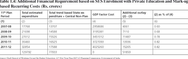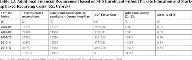 As India has entered an era of high economic growth with growth becoming multisectoral it faces manpower deficiencies. There is no denying the fact that high level of knowledge and manpower development can promote economic prosperity and international recognition vis-à-vis potential skilled labour force and other tangible socio-economic benefits. Therefore, financing higher education has come to the centre stage of debate and discussions among the policy makers across the globe. The origin of debate much relates to public and private funding of higher education. Even in most of the developing economies the shift from public funding to private funding is visible. Pressure of fierce intersectoral competition for public funds and also the requirement of massive funds for developmental projects aggravate financial stringencies. It is also not practically possible for Public higher education systems to meet growing demand for higher education, especially in view serious constraints. This has opened up new possibilities like the public private partnerships in higher education system. Total Financial Requirements based on a mark-up over existing recurring costs as presented in Table 1.3 show that the total additional outlay required for achieving the enrolment targets will increase from about Rs 4585 crores to Rs. 16,500 crores over the Plan period without private education. However, the financial requirements based on SES enrolment data with some share attributed to private education show the increase in outlay from Rs 4061 crores to Rs.15,265 crores, Table 1.4. This clearly suggests that efforts have to be geared up to increase the private spending to achieve the targeted enrolment rate rather than exclusively relying on public spending. And the objective of enhancing the accessibility of qualitative higher education with equity to a seemingly diversified population can be accomplished through effective and meaningful private participation rather than exclusive dependence on public funds. This public private partnership may take any form like public ownership with private participation, private ownership with public subsidy, etc. involving interplay between three stakeholders: the government, the individual learners and the private individuals or enterprises. Apart from many changes being witnessed in the traditional means of running higher education systems, the conventional approach of positive externalities of public expenditure on higher education is also slowly getting replaced by more productive and efficient private participation. The reasons for such a transitional change of treating education and technical education in particular not as a merit good but as a private good may be many, but factors like growing awareness of people to pay for qualitative education leading to better earning capacity in turn ensures a better tomorrow and the low price elasticity of enrolments which removes the fear factor of the private operators of loosing a sizeable market owing to relatively higher course fee are most important. But, private operators should not be given free hand to operate on the ground that private participation reduces the burden on government budgets, and helps ensure that the costs of higher education are borne by those to whom the benefits accrue. There are obvious concerns associated with the participation of private sector like motive of profiteering, degradation of quality, restriction on academic autonomy and the like.
